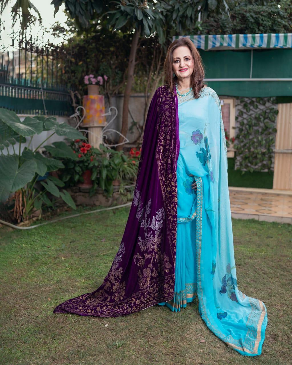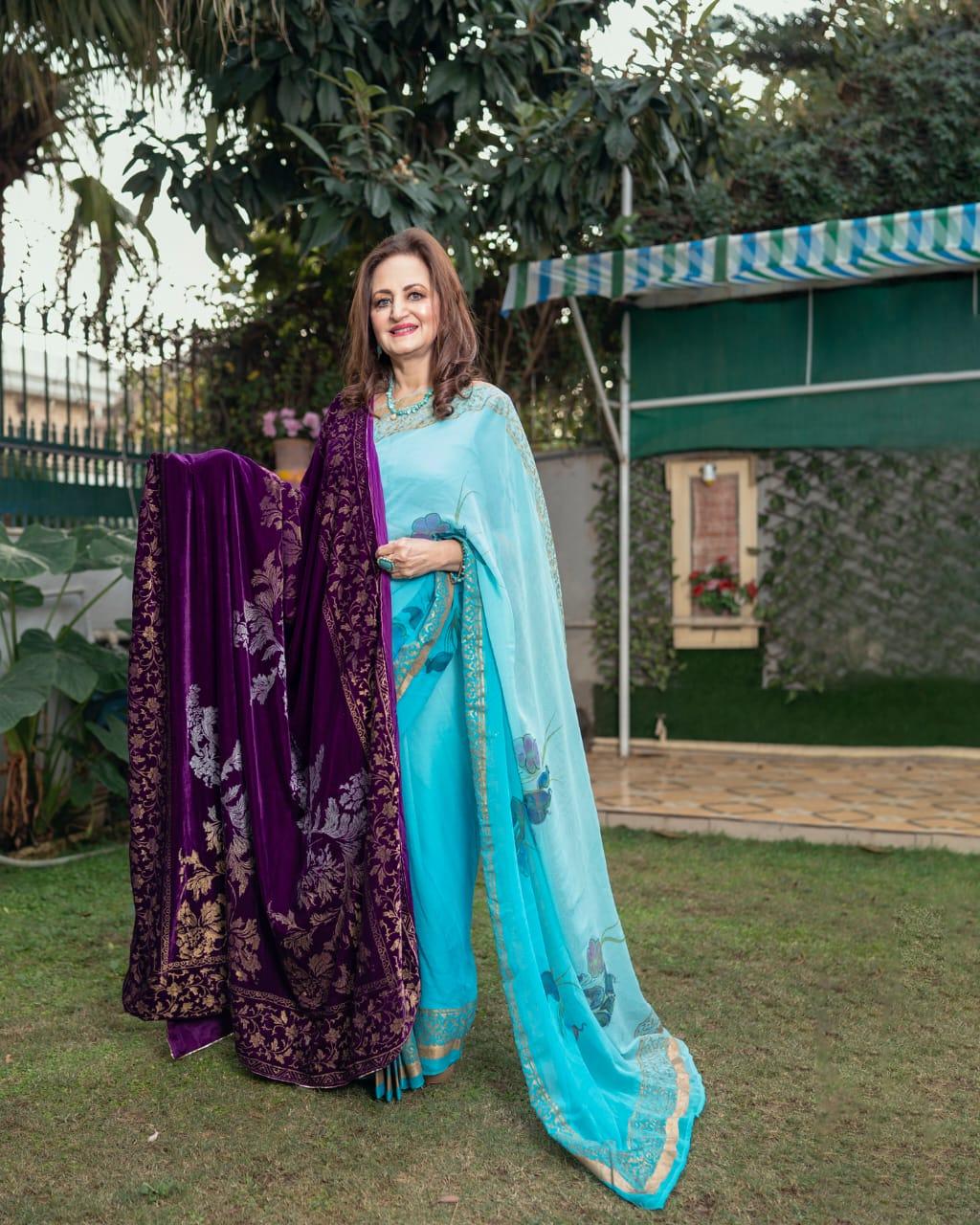 Pure velvet with golden border. Middle part is decorated with Chinese flowers with gold and silver colors. Back is covered with pure china silk 3yards dupatta. Edged with golden dori.